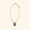 This necklace features an oval mother-of-pearl pendant engraved with Our Lady of Guadalupe. A border of colorful gemstones surrounds the pendant, giving it a bright and modern look. The design hangs from a gold plated link chain, making it both meaningful and stylish—perfect for everyday wear or as a special gift.