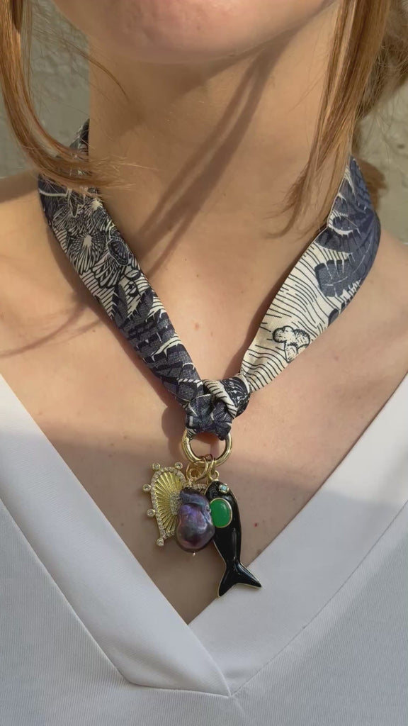 Each Scarf Charm Necklace features a hand-selected silk scarf curated by MCharms for its color, print, and elegance. The three charms are placed together on a ring-style charm clasp, which allows you to remove them or add your own charms whenever you like. Wear it around your neck, on your wrist, tied to your purse, or even wrapped around a straw hat for a chic beach-day touch. Every piece is limited and unique—no two are ever exactly alike.